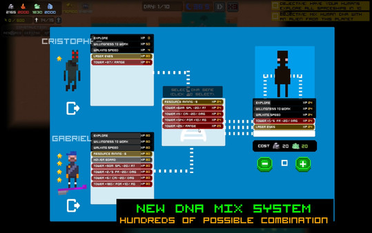 Смешайте немного ДНК разных видов, и вы сможете вывести людей с особыми способностями. Например, глаза-лазеры! Немного модификаций здесь, немного хакерства там, и они могут оказаться весьма полезными! В игре представлены следующие особенности: смешивание ДНК инопланетян и людей, постройка оборонительных и атакующих структур, улучшение базы с помощью технологий, мотивация людей для выполнения задач, противостояние роботам-врагам, боссы-роботы, множество планет и окружающих сред, встреча с четырьмя видами инопланетян и огромным космическим кальмаром.