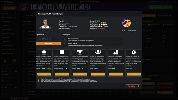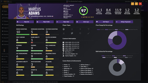 Игра Draft Day Sports: Pro Basketball 2024 позволяет тебе стать генеральным менеджером своей любимой баскетбольной команды. Ты можешь принимать все решения: от драфта, обменов и подписания свободных агентов до внесения замен, чтобы привести свою команду к чемпионской славе и стать династией.