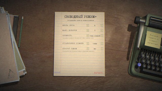 Игра включает в себя различные режимы, которые позволят вам проверить свои дедуктивные способности. Основной режим кампании можно дополнить свободной практикой, где вы сможете настроить уровень сложности, длину слов, количество попыток и временные ограничения. Для любителей соревнований предусмотрены ежедневные вызовы, которые позволят вам проверить свои навыки против детективов со всего мира. Атмосферу настоящего детективного романа создает интерфейс, оформленный под старинную печатную машинку, а также соответствующая звуковая атмосфера.