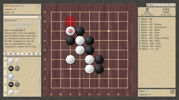 Кроме того, вы сможете играть против местного соперника на одном компьютере, против ИИ или устраивать матчи между ИИ: доступны различные настройки для размера доски (от 5x5 до 19x19), ручек, коми и времени. Используйте тренировочную доску, чтобы свободно расставлять и играть камни. Таким образом, The Conquest of Go предлагает богатый и разнообразный игровой опыт как для новичков, так и для опытных игроков, позволяя им развивать свои навыки и соревноваться с другими по всему миру.