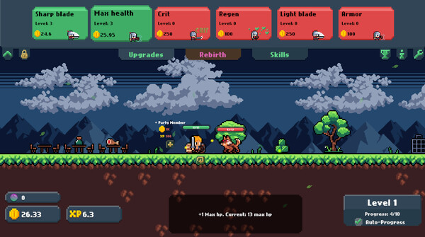Ваша команда будет автоматически сражаться с врагами, что позволит вам заниматься другими делами, пока игра идет. Вам нужно оптимизировать свою команду для выживания, чтобы обеспечить как можно больший прогресс. Это включает в себя назначение классов для слотов вашей команды, улучшение этих классов, разблокировку навыков, перерождение для получения улучшений знаний и многое другое.