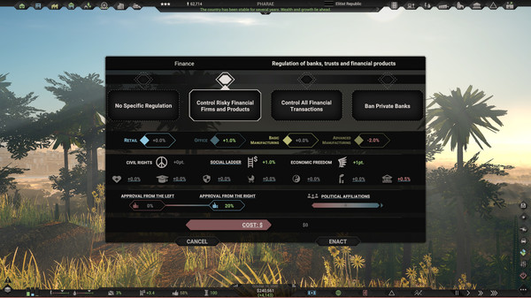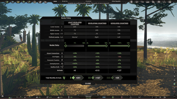 Особенности игры включают в себя богатые политические опции: 51 политика, 204 варианта выбора, религию, рождаемость и политические пристрастия. Ты сможешь редактировать законы и создавать свои собственные правила.