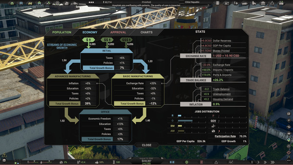 Citystate II - это также один из самых продвинутых экономических симуляторов в жанре градостроительства. В игре отображаются безработица, распределение доходов, инфляция, коррупция, иммиграционная политика. Игроки могут контролировать скорость роста населения и влиять на экономическое развитие страны.